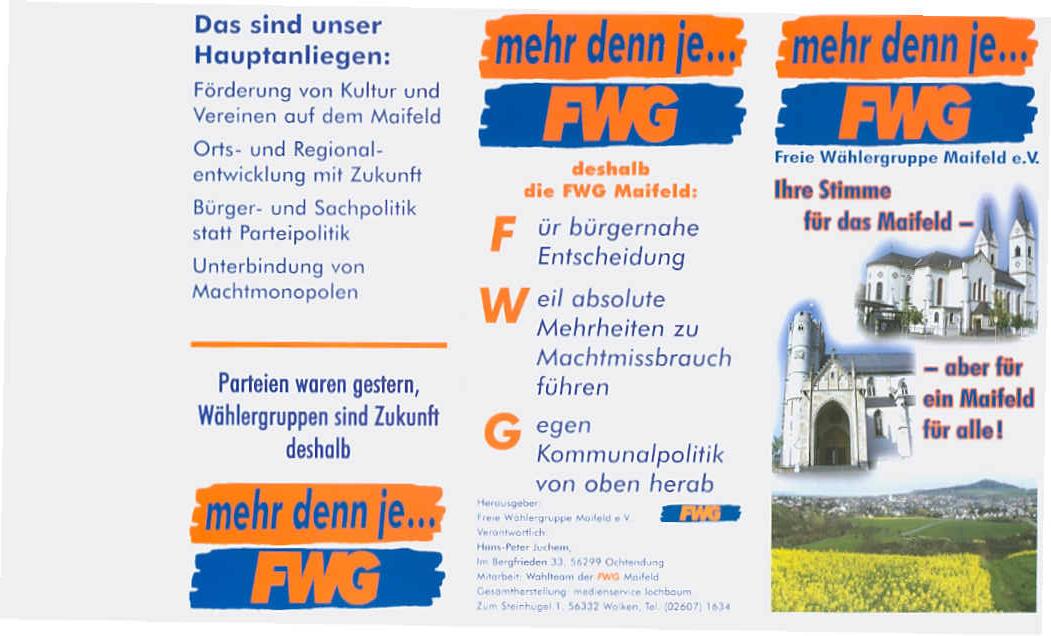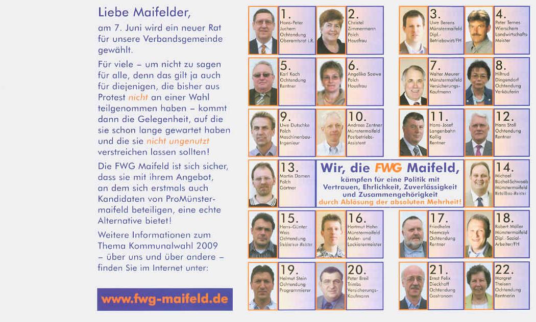 Wir empfehlen Ihnen die Liste der FWG-Maifeld sowie unsere Kandidaten, die sich gerne zu Ihrem Wohle auf Verbandsgemeinde-Ebene einsetzen werden.